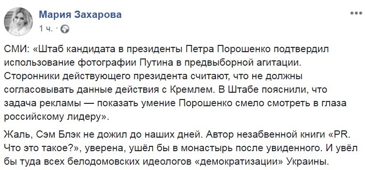 Спикер МИД выразила сожаление, что автор книги "PR. Что это такое?" Сэм Блэк не дожил до наших дней.
