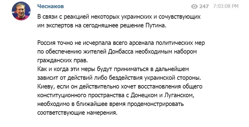 "В связи с реакцией некоторых украинских и сочувствующих им экспертов на сегодняшнее решение Путина.