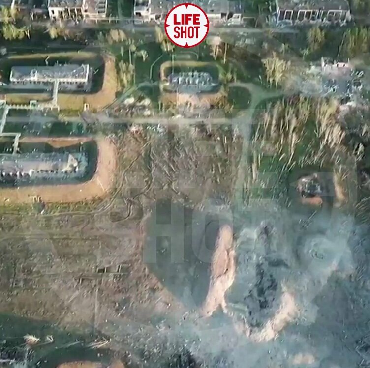 На них видна огромная воронка в земле, где до этого располагался склад. Кроме того, крыша предприятия изрешечена дырами от осколков.