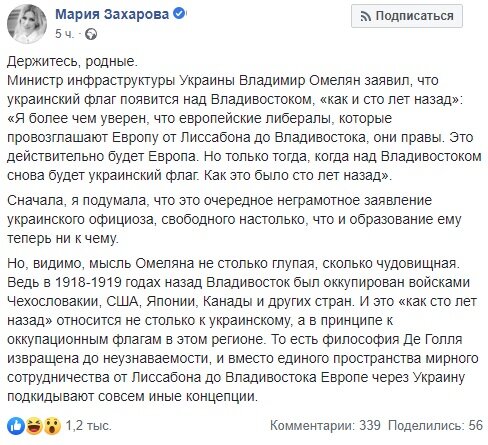 "Я подумала, что это очередное неграмотное заявление украинского официоза. Но, видимо, мысль Омеляна не столько глупая, сколько чудовищная. Сто лет назад, в 1918-1919 годах, Владивосток был оккупирован войсками Чехословакии, США, Японии, Канады. И это "сто лет назад" относится к оккупационным флагам в этом регионе", – подчеркнула представитель российского МИД, комментируя заявление.