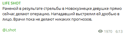 Как информирует Telegram-канал Life-shot, прогнозов по второй жертве пока нет, ей делают операцию. Раны девушки очень тяжелые: новокузнецкий стрелок выстрелил ей дробью прямо в лицо.
