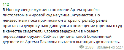 16 января произошла пугающая бойня в мировом суде Новокузнецка, в месте которое, казалось, в первую очередь должно было быть защищено от проникновения вооруженных людей. В суд, расположенный на улице Энтузиастов, без преград зайти внутрь с оружием удалось Артему Пакалову, который открыл огонь сначала по приставу, затем выбрал мишенью свидетельницу. Стрелка скрутили, когда он перезаряжал оружие, сообщает Telegram-канал "112".