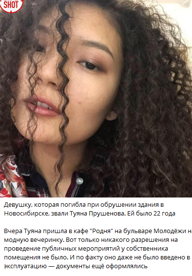 Появилось первое фото единственной погибшей в сегодняшней трагедии в Новосибирске. 22-летняя Туяна Прушенова 2 февраля пришла оторваться на "гаражную вечеринку", но после обрушения крыши раздевалки в кафе на проспекте Молодежи, 3б, корп.1, она так и не смогла выбраться из-под завалов. Фото опубликовали в Telegram-канале Life Shot.