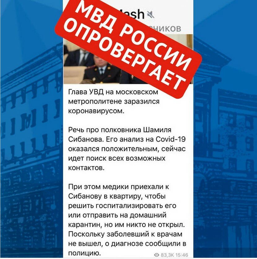 Информация, размещённая в сети Интернет о том, что начальник УВД на Московском метрополитене болен коронавирусом не соответствует действительности. 22 апреля тест показал отрицательный результат.