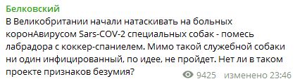 Российский политтехнолог Станислав Белковский возмутился тем, что в Великобритании собак "натаскивают" на больных коронавирусом. В свое Телеграм-канале он заявил, что инфицированных будет искать "помесь лабрадора с кокер-спаниелем", передает Российский Диалог.