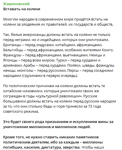 "Поляки, шведы, французы, немцы, монголы - перед русскими", - призвал Владимир Вольфович встать их на колени.