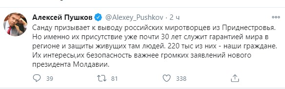 Член Совета Федерации Алексей Пушков дал понять, что в корне не согласен с призывом новоизбранного президента Молдавии Майи Санду о Приднестровье. Он назвал три причины, почему лидер партии "Действие и солидарность" не права в своих умозаключениях.