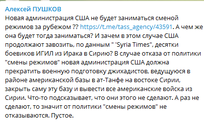 Член Совфеда Алексей Пушков не верит в то, что США оставят попытки "менять режимы" в мире. Он уличил американские власти в "завозе" десятков террористов из Ирака в Сирию.