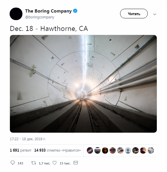— The Boring Company (@boringcompany) 19 декабря 2018 г.