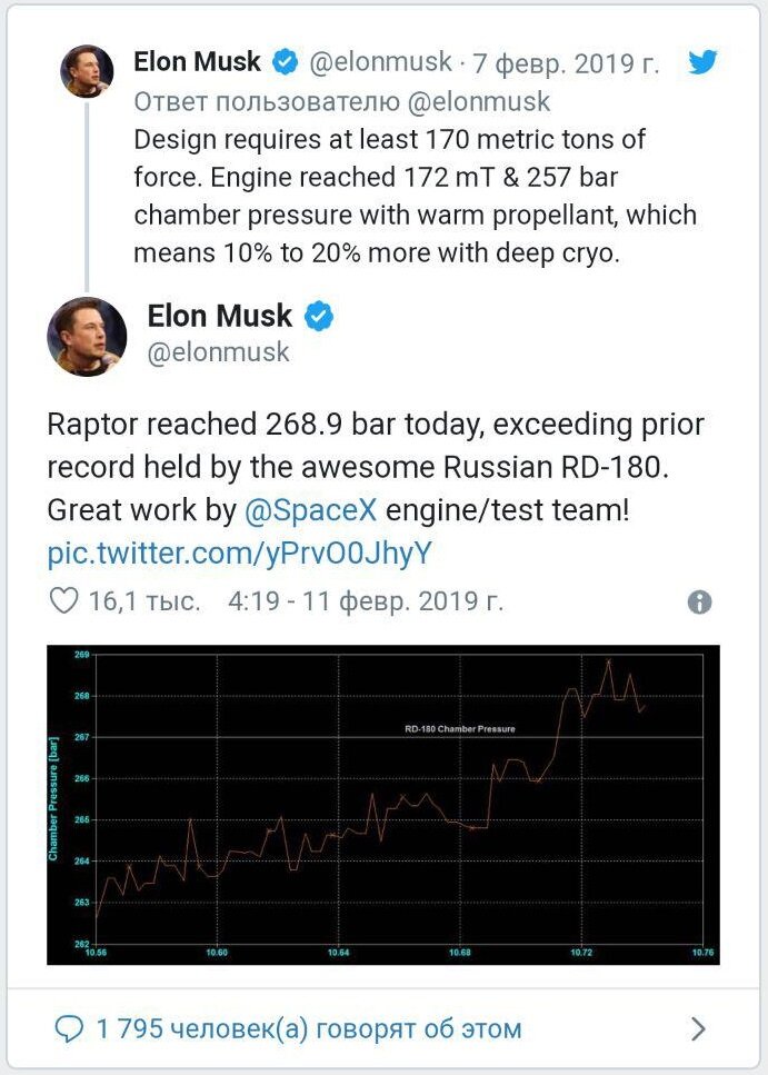 Как сообщает в понедельник, 11 февраля, "Российский Диалог", Илон Маск отрапортовал о превосходстве его нового ракетного двигателя Raptor над проверенным временем российским РД-180.