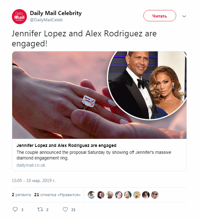 Как стало известно, популярная певица и любимица миллионов Джей Ло получила столь дорогостоящий подарок от бейсболиста Алекса Родригеса по случаю помолвки, передает "Российский Диалог" со ссылкой на The Daily Mail.