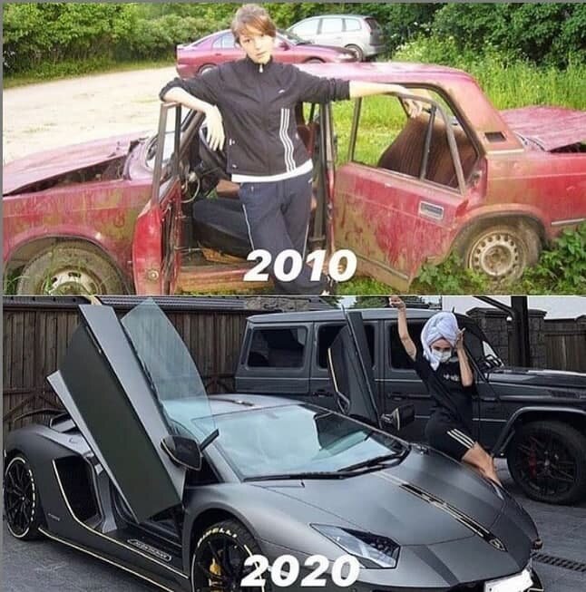На фан-странице звезд эстрады опубликовали коллаж из двух фото, на одном из которых популярная ведущая "Орла и решки" Анастасия Ивлеева стоит на фоне стареньких "Жигулей", а на другом фото (уже 10 лет спустя) красуется шикарный и современный спортивный "Ламборджини", на капоте которого восседает его хозяйка.