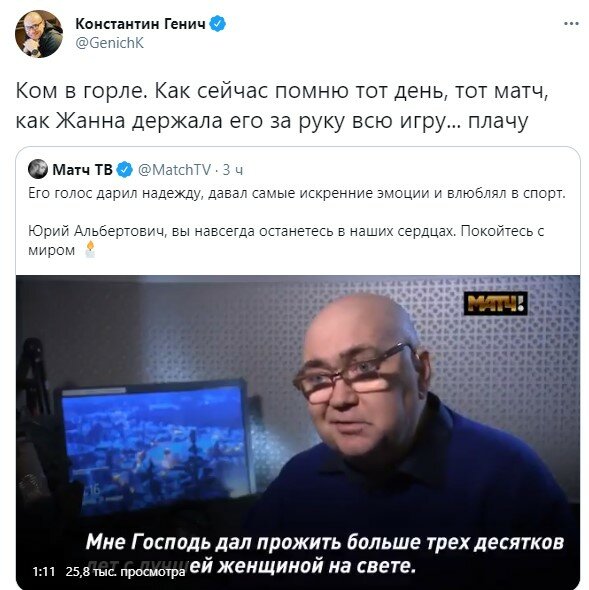 "Ком в горле. Как сейчас помню тот день, тот матч, как Жанна держала его за руку всю игру... плачу", - вспомнил Константин Генич.