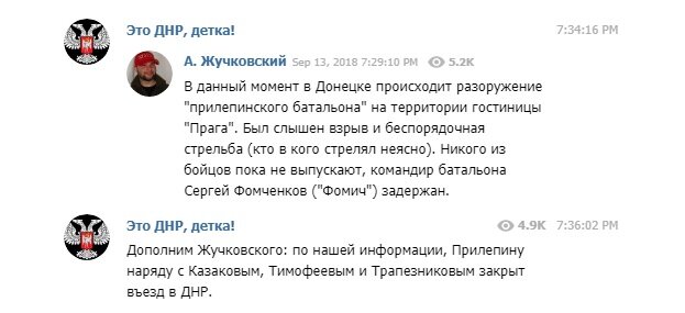 Telegram-канал Жучковского передает, что в Донецке занимаются разоружением батальона Прилепина. Мероприятия проходят на территории отеля "Прага".