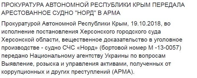 Украинская сторона изъяла задержанное российское судно "Норд" и передала его в Национальное агенство по розыску и управлению активами, полученными от коррупционных и других преступлений. Соответствующая информация распространена во вторник пресс-службой так называемой прокуратуры Крыма (структура остается в Генпрокуратуре Украины после воссоединения полуострова с Российской Федерацией), передает "Российский Диалог".