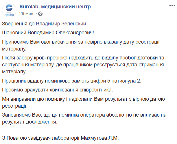 "Приносим Вам свои извинения за неверно указанную дату регистрации материала. После забора крови пробирка поступает в отдел пробоподготовки и сортирования материала, где сотрудником регистрируется дата получения материала. Сотрудник отдела ошибочно вместо цифры 5 нажала 2. Просим учесть волнение сотрудника. Мы исправили ошибку и направили Вам результат с верной датой регистрации", - написали представители Eurolab в обращении к Зеленскому.