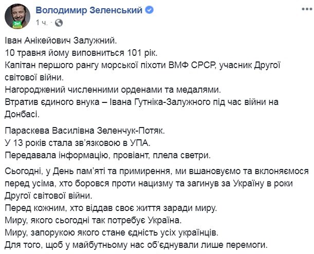 Новоизбранный президент Украины Владимир Зеленский в День примирения посетил Запорожье, где встретился с ветеранами Красной армии и УПА (организация запрещена в РФ - ред). На своей страннице в Facebook он опубликовал фото, на котором капитан первого ранга морской пехоты ВМФ СССР Иван Залужный пожимает руку связной УПА Прасковье Зеленчук-Потяк, передает "Российский Диалог".