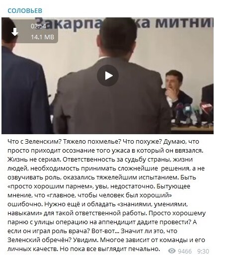 "Что с Зеленским? Тяжелое похмелье? Что похуже? На самом деле, я думаю, он просто приходит в осознание того ужаса, в который ввязался, жизнь - не сериал. Ответственность за судьбу страны, жизни людей, необходимость принимать сложнейшие решения, а не озвучивать роль, оказались тяжелейшим испытанием для Зеленского", – предположил российский тележурналист.