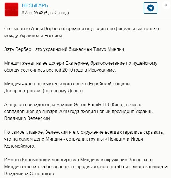 О связях Вербер с Зеленским писал и телеграмм-канал "Незыгарь".