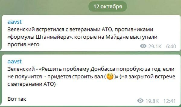 "Зеленский: решить проблему Донбасса попробую за год, если не получится - придется строить вал (на закрытой встрече с ветеранами АТО)", - написал в своем телеграм-канале главный редактор радиостанции "Эхо Москвы" Алексей Венедиктов.