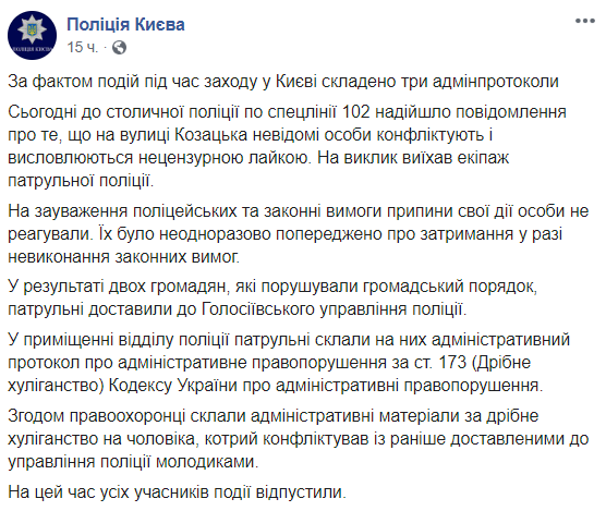 Нацполиция Киева подтвердила факт задержания активистов. Они составили три административных протокола о правонарушениях. Сама же Митрошина вынуждена была покинуть мероприятие в целях своей безопасности.