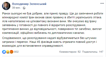 Президент Украины Владимир Зеленский отреагировал на признание Ирана в том, что Boeing 737 был сбит их ракетами в результате "ошибки". Глава государства, 11 граждан которого погибли в результате авиакатастрофы, в Facebook поставил ультиматум Тегерану.