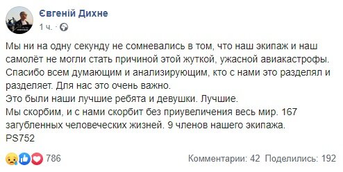 Президент МАУ Евгений Дыхне в социальной сети "Фейсбук" сообщил, что не сомневался в невиновности экипажа.