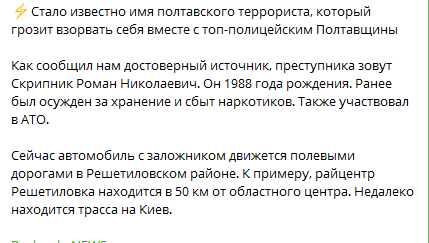 Полтавский угонщик, 23 июля взявший в заложники полицейского, оказался 32-летним местным жителем Романом Скрыпником - участником АТО, ранее уже имевшим судимость за хранение и сбыт наркотиков, отбывавшим наказание в местах лишения свободы.