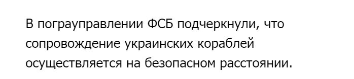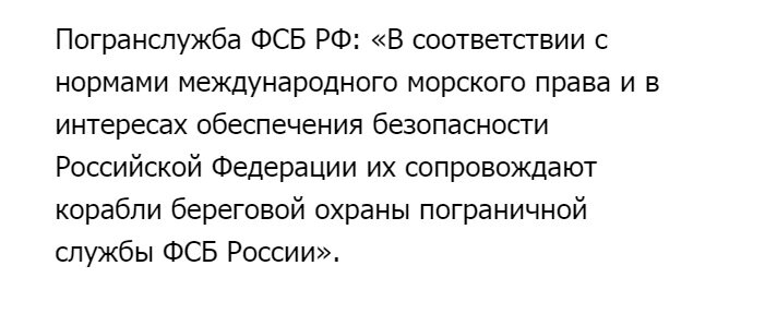 Согласно нормам международного права и с целью обеспечения безопасности Российской Федерации корабли береговой охраны Пограничной службы ФСБ РФ начали сопровождение украинских судов.