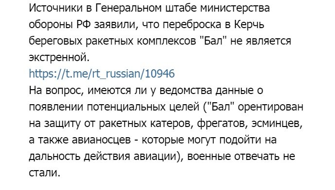 В свою очередь, источники телеграм-канала "СМИ ли" в Генеральном штабе Министерства обороны РФ отмечают, что переброска вышеназванных комплексов в Керчь не является экстренной.