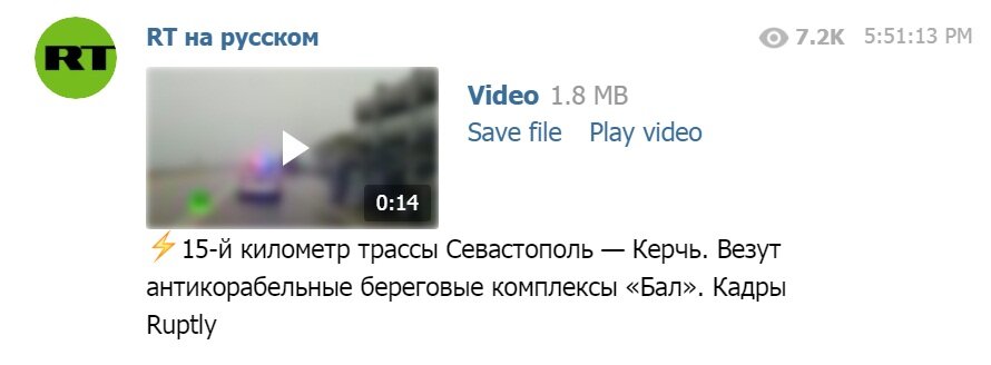 Телеграм-канал RT опубликовал видеозапись, на которой запечатлено передвижение антикорабельных береговых комплексов "Бал" на 15-м километре трассы Севастополь - Керчь, передает "Российский Диалог".
