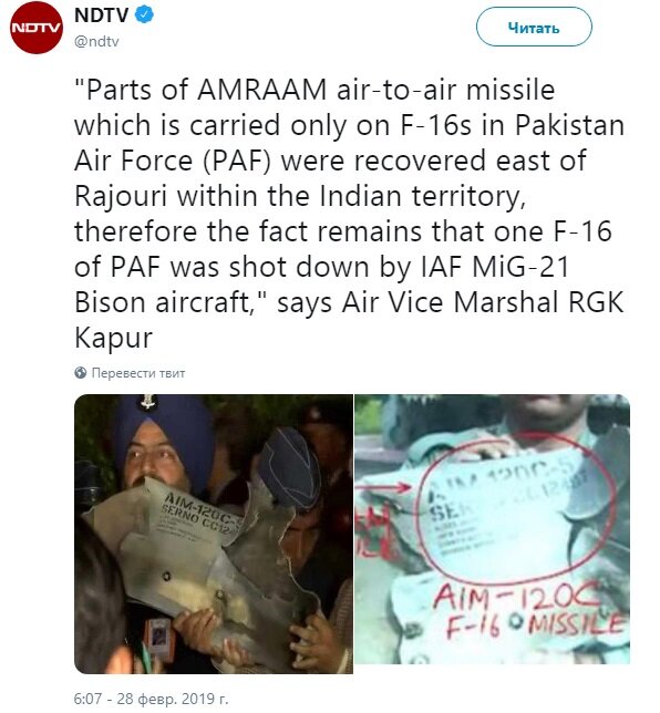 В качестве подтверждения этого в Индии продемонстрировали обнаруженные ранее части ракеты AMRAAM воздух-воздух, которые устанавливаются на F-16.