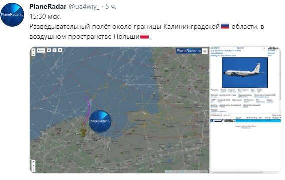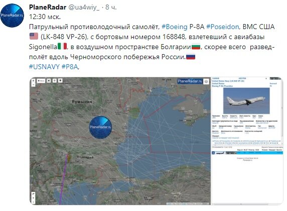 Первым поднялся в воздух и направился в сторону РФ противолодочный патрульный самолет Boeing P-8A Poseidon. Он вылетел из базы в Италии, пересек воздушное пространство Болгарии, и начал изучать Черноморское побережье. Чуть позже самолет радиоэлектронной разведки Boeing RC-135V Rivet Joint вылетел из Великобритании и провел разведывательный полет у границ Калининградской области, передает "Российский Диалог".