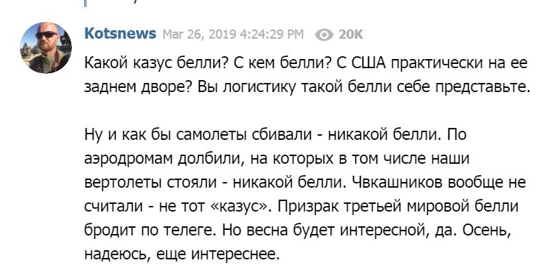 "Какой казус белли? С кем белли? С США практически на ее заднем дворе? Вы логистику такой белли себе представьте. Ну и как бы самолеты сбивали - никакой белли. По аэродромам долбили, на которых в том числе наши вертолеты стояли, - никакой белли. Чвкашников вообще не считали - не тот "казус", - возразил журналист в своем телеграм-канале.
