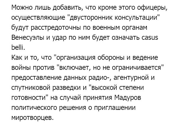 "Можно лишь добавить, что кроме этого офицеры, осуществляющие "двусторонник консультации", будут рассредоточены по военным органам Венесуэлы, и удар по ним будет означать casus belli", - сказано в сообщении.