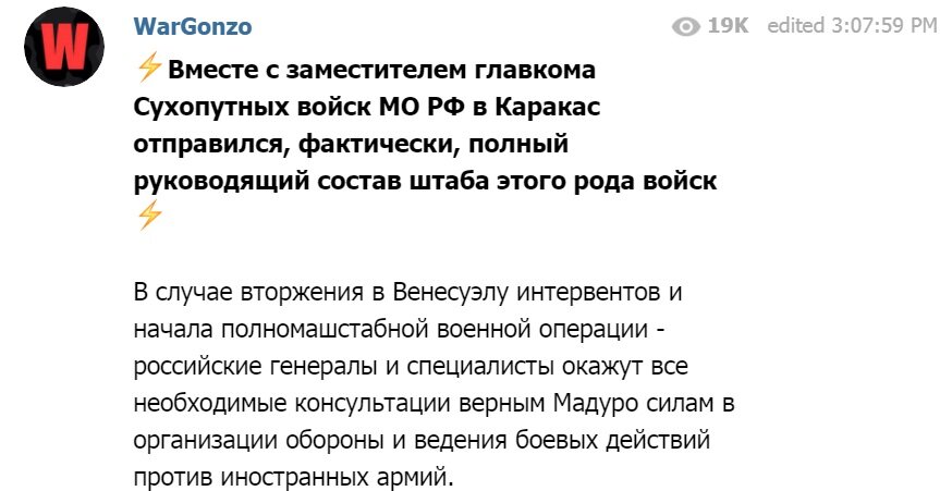 Тем временем телеграм-канал "СМИ ли" пишет, что российские военные будут сосредоточены по военным органам Венесуэлы, и удар по ним может привести к военному столкновению России и Запада.