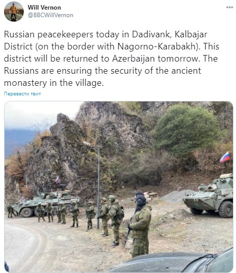 "Российские миротворцы сегодня в Дадиванке Кельбаджарского района (на границе с Нагорным Карабахом). Завтра этот район будет возвращен Азербайджану. Россияне обеспечивают безопасность старинного монастыря в селе", - говорится в описании к фото.