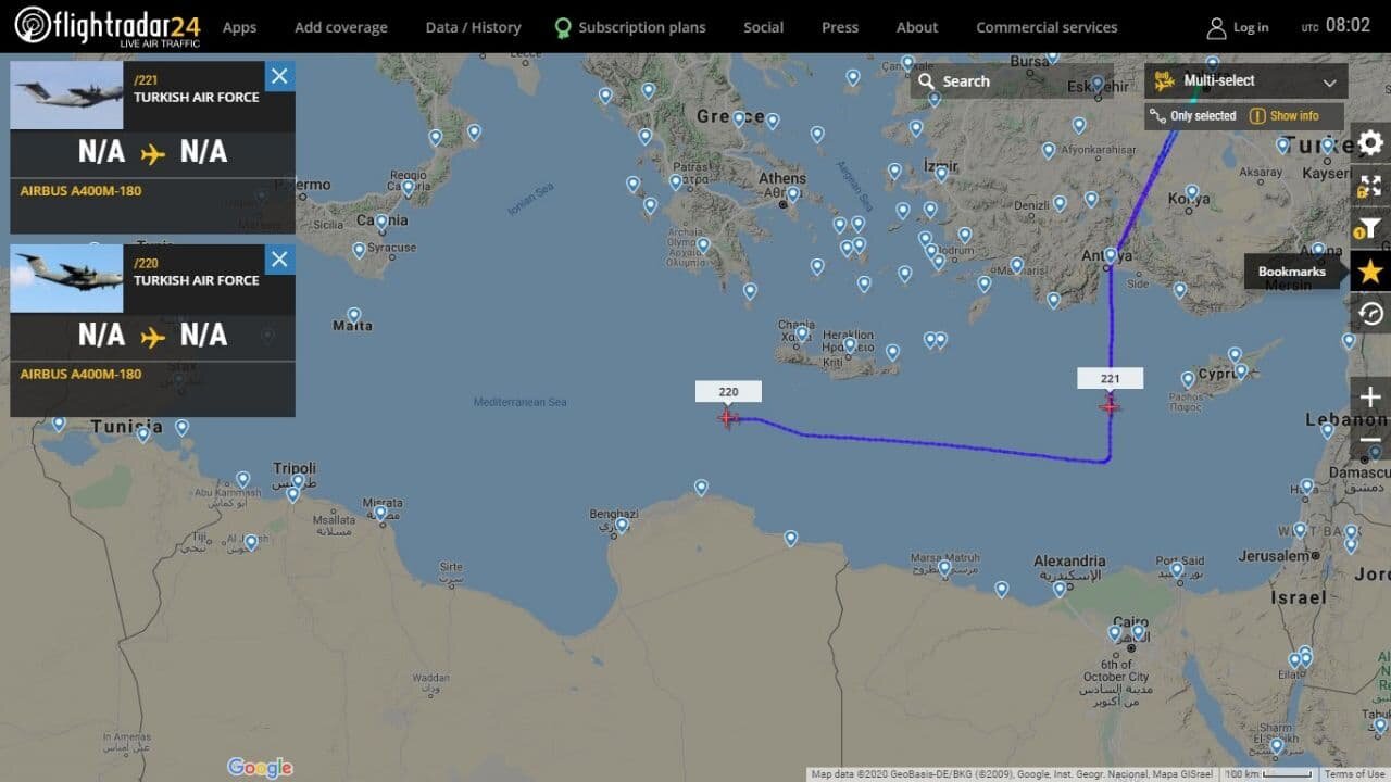 Согласно данным портала Flightradar24, отслеживающего передвижение авиации, два военно-транспортных самолета ВС Турции Airbus A400M-180 совершили рейс в Ливию в пятницу 25 декабря.