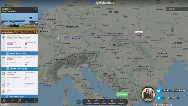 Карту передвижения "Боинга" из Германии к берегам Днепра опубликовали в Telegram-канале "Записки охотника", используя данные с сайта Flightradar24, передает Российский Диалог.