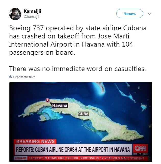 В пятницу, 18 мая, в аэропорту Гаваны потерпел крушение пассажирский "Боинг 737", на борту которого, по предварительным данным, находилось 104 человека, передает "Российский Диалог".