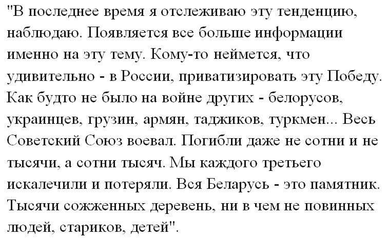 Белорусский лидер также негативно отнесся к прозвучавшему в одном из СМИ заявлению, что в Белоруссии якобы есть своя победа - 3 июля вместо 9 мая. Он подчеркнул, что в Белоруссии военные парады на День Победы проводятся в юбилейные даты, в другие годы парады проходят в день освобождения Минска от немецко-фашистских захватчиков - 3 июля. Эта же дата была утверждена в качестве Дня независимости.