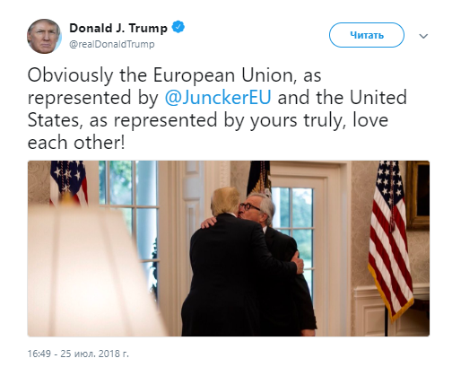 Как известно, не так давно Трамп и Юнкер провели встречу в Вашингтоне "для запуска новой фазы отношений" между США и ЕС. Тогда стороны заявили, что остались довольными результатами переговоров.