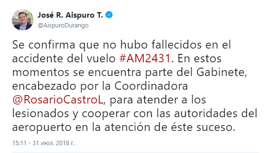Губернатор штата Дуранго Хосе Росас Аиспуро сообщил радостные новости, погибших в результате крушения нет. В основном пассажиры сами покинули самолет.