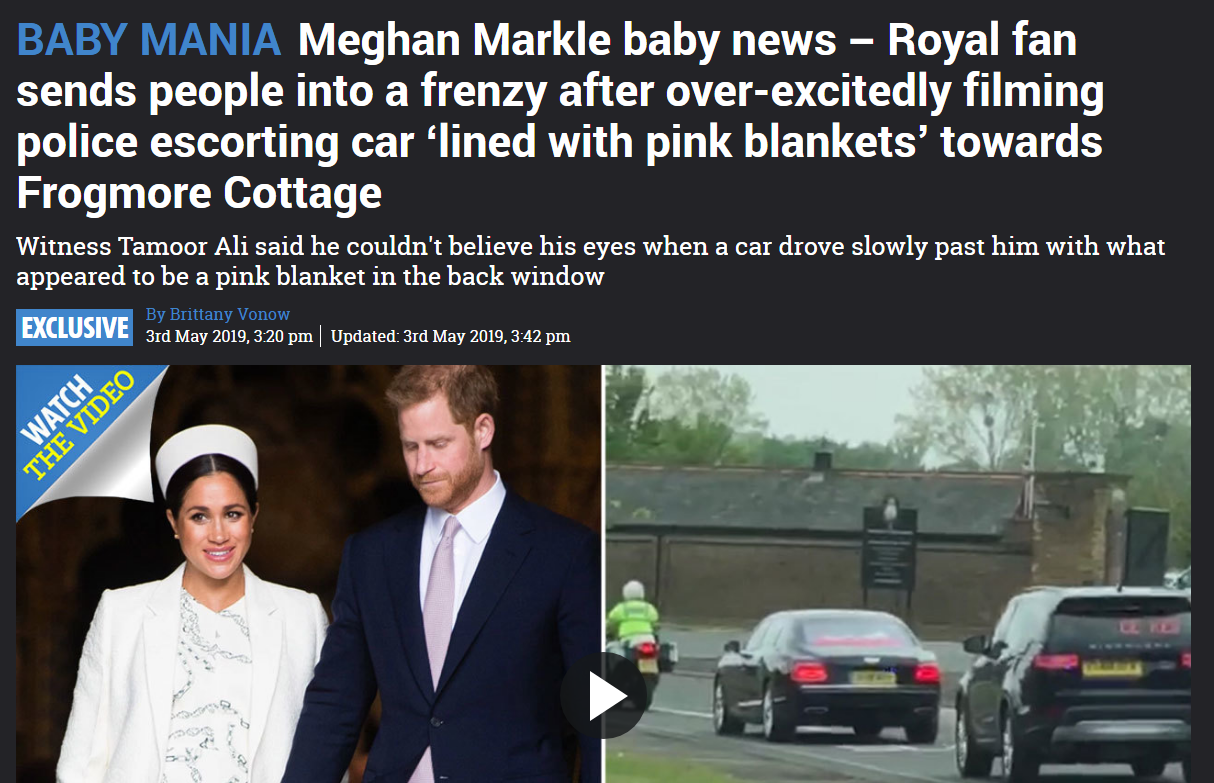 В пятницу, 3 мая, зарубежные СМИ опубликовали данные о тайном рождении девочки герцогини Сассекской Меган. Также в Сеть попали снимки с запечатленным кортежем под охраной полиции, в одном из автомобилей можно заметить розовое одеяло. Об этом сообщает Sun, передает "Российский Диалог".
