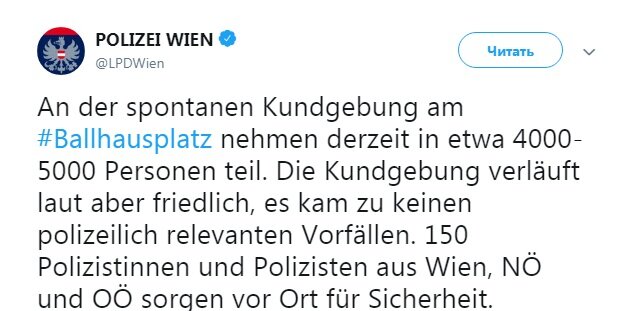 Тем временем около пяти тысяч человек собрались у ведомства федерального канцлера в Вене в ожидании заявления главы правительства Себастьяна Курца по скандалу вокруг Штрахе.