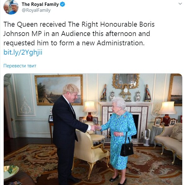 По традиции для вступления в должность главы правительства премьер-новичок должен посетить правящего монарха. Нового лидера правящей Консервативной партии Бориса Джонсона приняла королева Елизавета ІІ, передает "Российский Диалог".