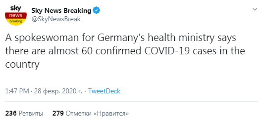 Вирус в Германии, как впрочем и в других странах мира, распространяется с пугающей скоростью. Еще 27 декабря официальные лица ФРГ сообщали, что общее число зараженных в государстве не превышало 21 человека. Власти страны объявили об эпидемии. Всего за сутки количество больных, у которых лабораторно подтвержден штамм COVID-2019, увеличилось почти в три раза.