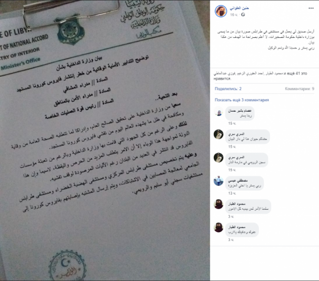 «Мой друг, работающий в больнице в Триполи, прислал фотографию заявления МВД так называемого ПНС, я, честно говоря, не знаю, какова цель этого заявления. Бог нам поможет и благословит нас», — рассказала девушка.