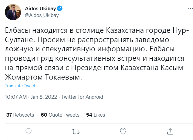 Информация о том, что экс-президент Казахстана Нурсултан Назарбаев покинул страну, является неправдивой, спекуляцией и ложью, это 8 января дал понять его пресс-секретарь Айдос Укибай.