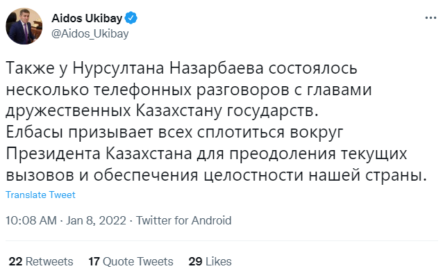 По словам Айдоса Укибая, бывший лидер Казахстана "призвал сплотиться вокруг Касыма-Жомарт Токаева", чтобы прекратить протест и сохранить страну единой.